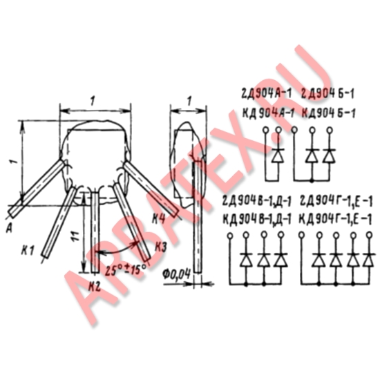 Диодные матрицы КД904А состоят из одного (2Д904А— 1, КД904А-1), двух (2Д904Б-1, КД904Б-1), трех (2Д904В-1, КД904В-1), четырех (2Д904Г-1, 2Д904Е-1, КД904Г-1, КД904Е-1) кремниевых, пленарных диодов, с общим анодом.