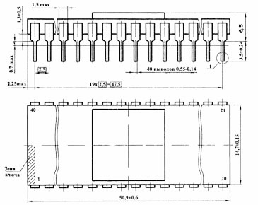 Микросхема М1821РУ55 представляет собой статическое оперативное запоминающее устройство емкостью 2048 бит (256x8) с портами ввода/вывода (два 8-битовых и один 6-битовый) и 14-битовым программируемым таймером.