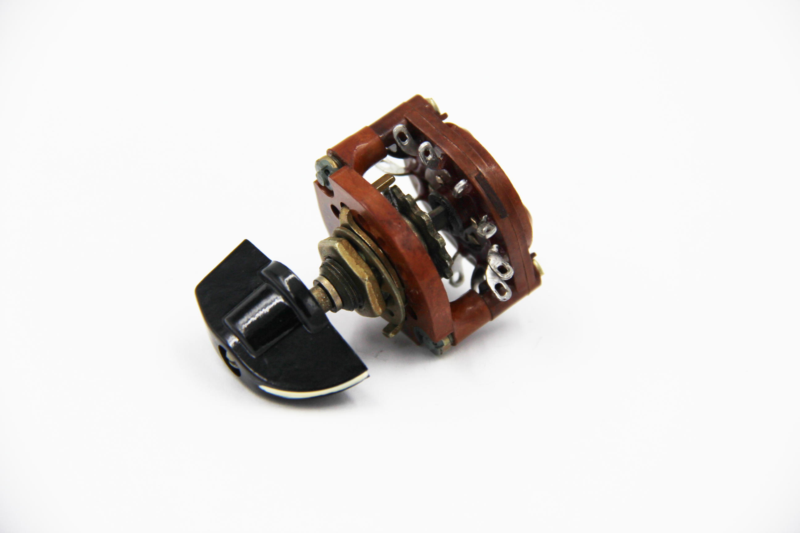 ПМ-3П3Н переключатель галетный карболитовый, малогабаритный, применяется для коммутации цепей сигнализации и управления с напряжением до 300В, силой тока до 2А и коммутируемой мощностью до 25Вт. Переключатель обеспечивает поворотное переключение контактов, расположенных на галетах. Метод монтажа путем фиксации оси в отверстии панели.