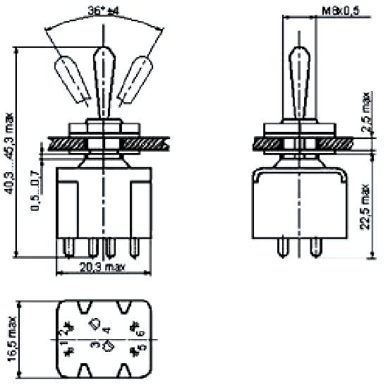 ПТ6-8В переключатель тумблерный, применяется для коммутации цепи сигнализации, питания и управления с напряжением 1х10-4В - 250В, силой тока 1х10-6А - 16А и коммутируемой мощностью до 1900Вт. Тумблеры выполняются с рычажным приводом, позволяющим укреплять резиновый защитный протектор и так и без него. В зависимости от фиксации рычага тумблеры выпускаются с фиксацией в трех положениях, в одном крайнем и среднем положениях и только в среднем положении. Монтаж проводов проводится пайкой.