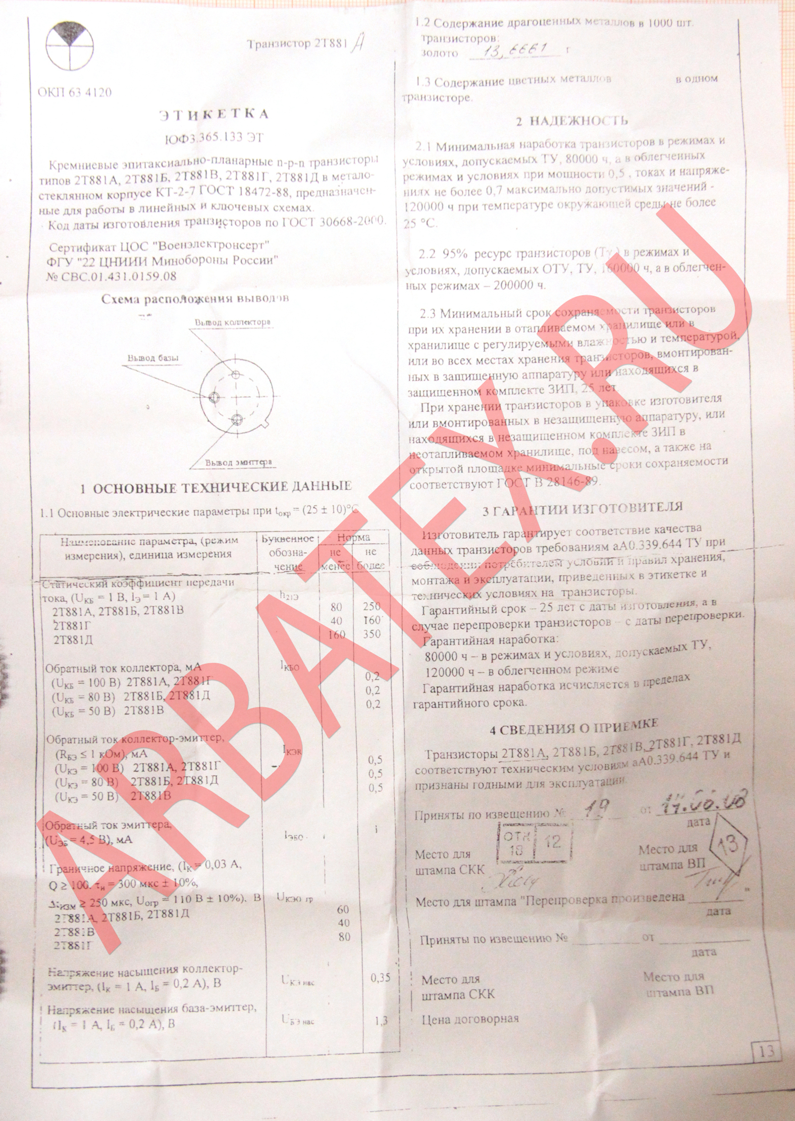 Масса транзистора в металлическом корпусе не более 2 г, кристалла не более 0,01 г.